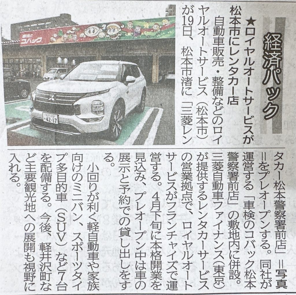「3/19付信濃毎日新聞」に、弊社の三菱レンタカー松本警察署前店オープンの記事が掲載されました。 2026年3月19日付の信濃毎日新聞に、弊社の三菱レンタカー松本警察署前店オープンの記事が掲載されました。 掲載日:2026年3月19日